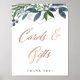 Ce panneau "cartes et cadeaux" de mariage tendance et élégant présente une forme géométrique en or faux rose entourée de magnifiques branches vertes et d'un script manuscrit en faux rose moderne.