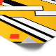 This design features a striking geometric composition dominated by a bright yellow background, contrasted with bold black and white parallel lines arranged diagonally across the canvas. Large and small red diamond shapes are positioned throughout the layout, adding a sense of movement and visual balance. Thin black and red accent lines enhance the dynamic flow, creating an abstract, modern aesthetic that emphasizes structure, contrast, and motion.