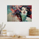A digital masterpiece fusing human beauty with geometric abstraction. Vibrant coral and turquoise tones explode around a serene face, creating a hypnotic contrast between inner calm and outer energy. Modern art ideal for decorating with sophistication.