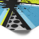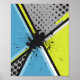 The design features a bold and modern geometric composition divided into four triangular sections that converge at the center. The colors used are light blue, lime yellow, light gray, black, and white. At the intersection, there is a dramatic black paint splatter with scattered streaks and droplets, adding a sense of energy and movement. The gray section is decorated with a halftone dot pattern in black, evoking a pop art aesthetic. Thick dividing lines in black, white, and yellow separate the sections, creating strong contrast and a dynamic visual impact.