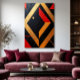 L'abstraction géométrique énergétique ! Diamants et triangles en noir, or et rouge intense, avec des textures ajoutant de la profondeur. Une explosion visuelle mêlant rigueur mathématique et passion chromatique, idéale pour les amateurs d'art moderne à la recherche de contrastes audacieux.
