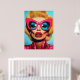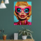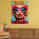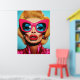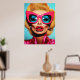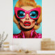 Un portrait surprenant et de haute couture d'une diva glamour avec des cheveux blonds volumineux, des lunettes de soleil roses et chaudes, des lèvres rouges audacieuses et un pré bleu électrique. Le look est féroce, rétro, et sans s'excuser fabuleux — un rêve pop-art aux couleurs vives.