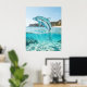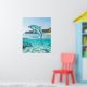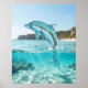 A graceful glass dolphin arcs through a sparkling tropical lagoon, its sleek body formed from transparent crystal with flowing contours, refracted light, and subtle aqua tinting. Sculpted fins and polished surfaces capture movement, joy, and ocean elegance. Turquoise water, coral shadows, pale sands, bright sunlight, and distant cliffs create a fresh uplifting coastal scene filled with brilliance. Perfect for beach homes, bathrooms, spa décor, nurseries, and anyone who loves dolphins, marine life, and serene premium wall art.