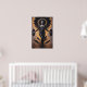 A divine figure embodying the duality between light and darkness. With imposing wings and a golden halo, she raises black circles as bearers of secrets, while flaming leaves emerge from her legs, symbolizing rebirth. The palette of blacks and golds creates a mystical and powerful atmosphere, perfect for those seeking a piece that dialogues with mythology and spirituality. Ideal for spaces that value drama and symbolism, this work transforms walls into portals of ancient legends, inspiring admiration and reflection.