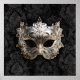 A richly adorned masquerade mask features intricate gold and silver filigree, highlighted by blue gemstones. The ornate design stands out against a patterned damask background.