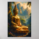 This artwork features a radiant golden Buddha statue seated in deep meditation, set against a breathtaking vista of mist-shrouded Thai mountains and lush tropical jungle. The warm, glowing light of the setting or rising sun streams through the palm fronds, highlighting the exquisite detail of the statue and casting a mystical, ethereal glow over the landscape.