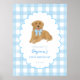 Welcome your guests in the sweetest way with this golden retriever first birthday welcome sign! Featuring an adorable golden retriever puppy with a blue gingham bow and matching checkered background, this personalized party poster adds the perfect touch of warmth and charm to your little one’s celebration.