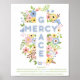 Une affiche d'art numérique vibrant présente une croix drapée d'une profusion de belles fleurs. Les mots "GRÂCE & MISÉRICORDE" sont écrits sur la traverse, avec le passage d'Éphésiens 2:4-6 transcrit soigneusement en dessous. Les lignes épurées et les couleurs riches du style d'art numérique créent une représentation visuelle puissante du message de l'affiche.