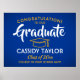 Ajoutez une touche personnalisée à une célébration de remise de diplômes d'études supérieures ou secondaires avec une affiche royale bleue et or 18"x24" personnalisée. L'image et toute la formulation de ce modèle de signalisation téléchargeable sont simples à customiser, et les couleurs peuvent être changées avec l'outil de design Zazzle. Le design se compose d'un casquette en carton de mortier, d'une typographie classique élégante et d'une calligraphie moderne élégante. Veuillez noter que l'or est imprimé de couleur jaune, pas de papier peint. Cette affiche de remise de diplômes imprimable est une façon élégante d'accueillir vos amis et votre famille à une fête spéciale. Félicitations au diplômé !