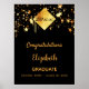 Un arrière - plan noir chic. Décoré d'étoiles dorées dégoulinantes et d'un casquette en faux or abstrait, casquette, haut de gamme avec l'année à l'intérieur. Personnalisez et ajoutez un nom, un nom d'école/année. Le texte : Félicitations et le nom sont écrits avec un grand script de style à la main moderne. Une affiche de bienvenue pour une fête de remise de diplômes.
