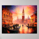 Ce tableau captivant dépeint Venise au coucher du soleil avec des couleurs chaudes et intenses qui se reflètent sur le Grand Canal. Les gondoles, l'architecture historique et la tour emblématique de San Marco créent un magnifique paysage italien. Le style artistique audacieux fait ressortir le romantisme et le mystère de Venise, ce qui en fait une pièce parfaite pour n'importe quel espace.