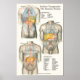 Graphique d'anatomie de la topographie humaine de surface. Affiche la topographie de surface en relation avec les organes internes et les artères principales. Les vertèbres et les côtes sont numérotées. Les traits de la scapula, de l'humerus supérieur, du bassin et du fémur supérieur sont superposés sur les organes internes. Clé au bas de chaque illustration pour identifier les organes et artères internes. Carte agréable pour s'adapter à n'importe quel bureau, salle de classe ou maison de professionnels de la santé pour les étudiants.