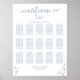 Cette conception comprend un graphique de disposition de sièges de bienvenue de mariage floral, un nom de numéro de table de sièges d'invité, un script de calligraphie élégant tendance, un texte de police de typographie fantaisiste, un panneau d'affiche de réception de mariage, une décoration de réception de mariage moderne tendance, une verdure botanique feuillage feuilles, avec thème de couleur bleu vrai crépuscule, un fond bleu simple texte blanc, pour l'affiche de disposition de réception de mariage