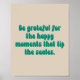 Embrace positivity with this retro-inspired motivational quote poster that reminds you to "Be grateful for the happy moments that tip the scales." Designed in a vintage color palette of soft beige with bold green typography, this wall art brings a warm, uplifting vibe to any space. Perfect for home offices, classrooms, or living areas, this poster is available as a digital download or printed option to suit your needs. Ideal for anyone seeking daily inspiration, gratitude reminders, or a touch of nostalgia in their decor, this piece makes a thoughtful gift or personal addition to your walls.