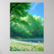 Immerse yourself in the serenity of this riverbank, where the calm waters flow past a vibrant green landscape. White flowers bloom among the lush grass, while tall trees tower over the scene, providing a peaceful atmosphere. Take a moment to breathe in the fresh air and appreciate the beauty of nature at its finest.