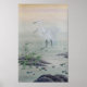Les grues dans la rivière chinoise est un tableau brosse dans le style traditionnel chinois "gongbi". Aquarelle et encre sur papier de riz. Depuis l'Antiquité en Chine, la grue est considérée comme un oiseau bon marché, à côté du légendaire phoenix parmi tous les oiseaux avec un savant pois. C'était aussi un symbole de longévité et d'incorruptibilité. Parce qu'une grue était considérée comme l'oiseau de haut rang, elle était utilisée comme la plus haute démarcation judiciaire de la Chine impériale, et son apparition sur l'insigne de rang de la robe d'un fonctionnaire signait que le porteur était un fonctionnaire du premier, ou du plus haut rang. La grue est généralement représentée seule sur un rocher entouré par la marée montante, qui représente l'atteinte du rang civil le plus élevé. Comme le mot chinois "chao" signifie à la fois marée et gouvernement, dynastie, ou avoir une audience avec un empereur. Ainsi, une grue devant la marée représente un ministre de haut rang devant son empereur. Même rester seul signifie "avoir atteint quelque chose par ses propres efforts", être réussi par la diligence dans les études. GongBi est une technique minutieuse et réaliste de la peinture chinoise, à l'opposé du style XieYi interprétatif et librement expressif. La technique demande que les coups de pinceau "soient aussi détaillés que possible", en utilisant des coups de pinceau très détaillés qui délimitent les détails très précisément et sans variation indépendante ou expressive. En outre, il tente de trouver un équilibre entre l'expression artistique et la vitalité, est souvent très coloré, et représente généralement des sujets figuraux ou narratifs. Gongbi nécessite d'abord le dessin avec des lignes fines pour représenter les ressemblances exagérées des objets, puis ajoute des rondelles d'encre et de couleur couche par couche pour approcher la perfection de l'exquisité et de l'art fin.