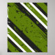 Un arrière - plan abstrait audacieux avec des rayures en diagonale vert vif, noir profond et blanc vif. Les bandes sont superposées avec une texture grunge qui comprend des rayures, des arêtes en mauvais état et des éclaboussures de peinture éparpillées. Les effets de brosse rugueuse ajoutent du mouvement et de l'intensité, donnant au design une sensation énergétique, pointue et moderne. La combinaison de lignes pointues et de textures chaotiques crée un contraste frappant qui fait ressortir l'oeuvre d'art.