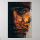 Découvrez le bord urbain brut avec ce portrait à double exposition saisissant. Un jeune homme regarde directement devant, son expression intense et focalisée. Une ligne d'horizon de ville grasse est astucieusement tapissée sur sa joue, mise en valeur par un éclat jaune/orange vif qui rayonne derrière les bâtiments. Le design général possède une sensation grungy distincte, captant l'énergie et la texture non filtrées des rues. Parfait pour ceux qui apprécient l'art contemporain, l'esthétique urbaine audacieuse et les portraits à fort impact direct.