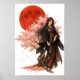 Illustration fantastique élégante d'une femme samouraï sous des fleurs de cerisier et une lune rouge, mélangeant l'esthétique japonaise, l'ambiance dramatique et l'art numérique très détaillé. Disponible en plusieurs couleurs. Œuvre d'art optimisée pour les vêtements et accessoires sombres et clairs.