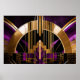 Une superbe représentation d'une salle de musique de style Art déco. Les couleurs d'or, de violet et de noir confèrent un aspect élégant et sophistiqué. Les formes géométriques et la symétrie sont superbes.