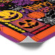 Illustration vibrante et complexe des motifs d'Halloween, avec une variété de symboles iconiques tels que les lances jack-o-lanternes, les chauves-souris, les araignées et les toiles, dressés contre un arrière - plan orange et violet chaleureux et sinistre, avec des lignes audacieuses, des formes géométriques et des polices stylisées, avec des tons noir, jaune et rouge pour créer une atmosphère festive et éffrayante, avec des détails et des textures complexes qui évoque l'esprit de la saison d'Halloween.