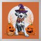 Joli Dalmatien dans un casquette de sorcière violette avec jack-o-lanternes éffrayant pour Halloween.