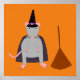 Cette affiche impressionnante présente une image art numérique d'une mignonne sorcière de rat gris avec oreilles roses, nez, pieds et queue. Le rat porte un casquette pointu noir avec une boucle d'or et des étoiles violettes tout autour. Les rats portent aussi un manteau noir couvert d'étoiles violettes. A côté du rat, un balai brun fait de brindilles. Ce rat est habillé prêt pour une fête d'Halloween.