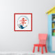 Colorful illustration features 'Happiness" Japanese calligraphy center with blue crane wreath, white background and red border.