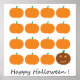 A cute patch of festive orange pumpkins are joined by a happy little holiday jack o' lantern at the end of the line. Happy Halloween!