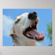 Photographie d'un lévrier avec sa bouche ouverte et les yeux qui crient dans un sourire de chien heureux.