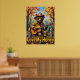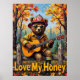 Cette oeuvre d'art chaleureuse capture un ours habillé d'équipement de pompier, dont un casque et des lunettes de soleil, jouant d'une guitare acoustique, confortablement assis sur une clôture en bois au milieu d'un décor d'automne coloré. Les feuilles tombés décorent le sol, et les arbres au-dessus sont en feu avec les couleurs de l'automne. Un bocal de miel avec un plongeur se trouve à proximité. Les traits épais et texturés de la peinture ajoutent à la qualité attachante de l'image, avec les mots "Love My Honey" en vedette ci-dessous.