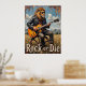 Cette oeuvre d'art captivante présente un lion, orné de lunettes de soleil et d'une veste en cuir, créant "Heartland Harmony" sur une guitare électrique, équilibré sur une vieille roue de chariot. Le cadre est un champ pittoresque sous un ciel texturé, incarnant un mélange de nature et d'esprit rebelle. L'épaisse et expressive impasto ajoute une qualité tangible à la scène, faisant résonner profondément le message "Rocher ou Mourir".