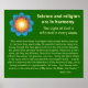 La science et la religion sont en harmonie. La Lumière de Dieu se reflète dans chaque atome (avec une fleur de lotus à 9 points). "Ce qui existait déjà existait déjà, mais pas dans la forme que tu vois aujourd'hui. Le monde de l'existence est né par la chaleur générée par l'interaction entre la force active et celle qui en est le destinataire. Ces deux-là sont les mêmes, mais ils sont différents. Ainsi le Grand Faire-part vous informe-t-il sur cette structure glorieuse... En vérité, la Parole de Dieu est la Cause qui a précédé le monde contingent — un monde qui est orné des splendeurs de l'Ancien des Jours, mais qui est renouvelé et régénéré en tout temps... Dis : La nature dans son essence est l'incarnation de Mon Nom, le Créateur, le Créateur." — Bahá'u'lláh