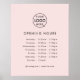 Un simple logo personnalisé d'ouverture d'heures d'ouverture modèle d'affiche dans un style minimaliste moderne sur un arrière - plan rose vif. Ce modèle polyvalent vous permet de concevoir facilement une liste d'heures d'ouverture personnalisée pour votre magasin, salon, restaurant, café ou toute autre entreprise. Besoin d'aide ? N'hésitez pas à me contacter en utilisant le bouton de message. Je suis heureux de vous aider avec votre personnalisation, des articles supplémentaires ou des commandes personnalisées.