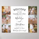 Accueillez les invités de votre mariage à votre cérémonie ou réception avec un élégant poster personnalisé 6 photos en collage de 45 x 60 cm. Les images et tout le texte sont faciles à personnaliser. (CONSEIL DE PLACEMENT D'IMAGE : un moyen simple de centrer une photo exactement comme vous le souhaitez est de la rogner avant de la télécharger sur le site Web de Zazzle.) Le design moderne minimaliste noir et blanc présente six images de votre choix, une calligraphie de style script manuscrit chic, une typographie vintage inspirée de l'art déco et des messages personnalisables qui lisent "Bienvenue dans notre pour toujours heureux" et "merci d'être venu". Ce panneau de bienvenue de mariage est un moyen élégant de partager des photos de fiançailles tout en ajoutant une touche personnelle aux décorations de célébration de votre jour spécial. Félicitations aux mari