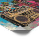 Art urbain contemporain célébrant la culture hip-hop de Los Angeles avec silhouette de breakdancer contre skyline de la ville. Caractérisé par un texte "HIP HOP", des graphiques vintages de boombox, des palmiers et des bâtiments du centre-ville de Los Angeles en silhouette contre un grand soleil jaune. Associe l'esthétique du graffiti aux images de culture urbaine des années 80 et 90 rétro dans une palette de couleurs rose, bleu et jaune audacieuse.
