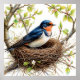 L'illustration détaillée d'une hirondelle de grange perchée dans son nid sur une branche fleurie dégage une atmosphère sereine et naturelle.