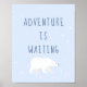 Belle neige d'hiver bleu avec la mention "L'aventure est en attente", découverte de la nature et l'aventure ours polaire parfait pour enfants pépinière, chambre d'enfants, chambre, salle de jeux et autre salle. texte personnalisé et monogramme et couleur arrière - plan. Conception neutre pour les garçons et les filles.