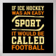 L'affiche Hockey Contre Football présente le texte jaune et or et deux bâtons de hockey. Cette affiche du joueur de hockey dit : Si le hockey sur glace était un sport facile, on l'appellerait le football!
