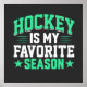 Une affiche de hockey avec du texte vert et blanc sur fond noir indique Hockey est ma saison préférée !