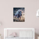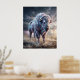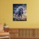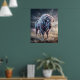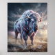 A massive hologram bison charges across endless futuristic storm plains, formed from transparent muscle geometry, glowing skeletal lines, and luminous vapor energy. Electric blue, silver, violet, and amber pulses race through its broad frame, emphasizing unstoppable strength. Lightning strikes, dark thunderclouds, wind-swept grass, cracked terrain, dust spirals, and distant towers create dramatic cinematic depth. This commanding bison design blends raw frontier power with advanced technology, ideal for offices, gaming spaces, studios, and collectors of bold wildlife imagery.