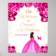 Ce panneau de bienvenue élégant et glamour pour la fête d'anniversaire présente une belle princesse à la peau foncée dans une robe de boule rose chaud. Le texte combine écriture manuscrite et polices sans serif modernes pour un look élégant et sophistiqué. Les arrangements floraux, papillons et confettis d'or créent un mélange parfait de rustique et de chic. Graphiques par www.etsy.com/uk/shop/SunflowerDayLove