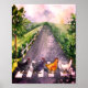 Une jolie aquarelle illustrant le paysage vallonné et quatre poulets, un blanc un brun deux noir, traversant la route en ligne. Un complément amusant à votre décor maison.