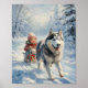 Un chien Husky tire un enfant heureux et souriant sur un traîneau à travers un paysage enneigé.
