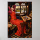 “I am Half Sick of Shadows, said the Lady of Shalott” by John William Waterhouse captures a quiet moment of longing and unease inside a richly detailed medieval interior. The Lady sits in vivid red, her posture tense and distracted, as threads and bright yarn spill across the checkered floor. Beside her, the loom and its patterned tapestry suggest hours of careful work, yet her attention drifts toward the light beyond the window.