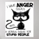 A humorous and sarcastic black-and-white graphic design showcases a black cat with a long tail and a grumpy expression. The bold black text reads, "I have anger issues and a serious dislike of stupid people." This design is available on various products, making perfect gifts for cat lovers.