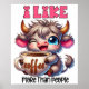 A funny, sarcastic, and colorful design showcases an adorable highland cow holding a steaming cup of coffee. The cow, with big blue eyes and a playful wink, has gray fur. Vibrant text reads, "I like coffee more than people." This charming design is available on various products, making it a perfect gift for coffee lover.