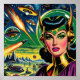 A futuristic conflict with rockets and ufos. With all this excitement the beautiful heroine seems to have something else on her mind…“I think I left the iron on.” The vivid colors, bold energy, and vintage space theme pay tribute to the thrilling imagination of midcentury science fiction book covers and movie posters.