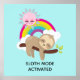 Une affiche avec une illustration montrant une paresse marron amusante qui paresse joyeusement sur une branche d'arbre. Un arc-en-ciel coloré derrière lui, accompagné d'un soleil rose planant sur la tête. Mignonne, adorable et tendance. Un peu d'humour avec le texte disant : Mode de fente Activé. Peut être changé ou personnalisé avec un nom ou un autre dicton si vous le souhaitez.