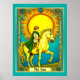 Poster sur une illustration de la carte tarot, "Le Soleil", représentant un soleil radieux dominant le ciel, ses rayons dorés entourant un garçon à cheval blanc. Il symbolise l'innocence et la vitalité, tandis que l'arrière - plan bleu vif rayonne de joie et de clarté.